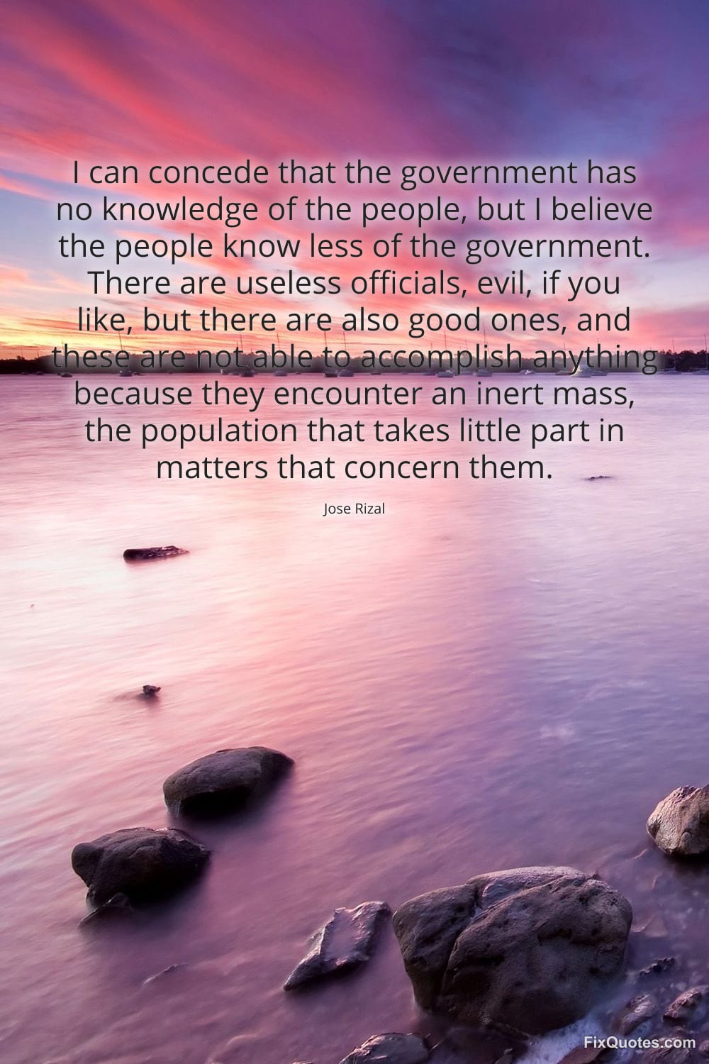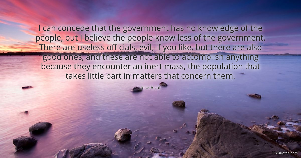Rizal, Jose. (2026, February 10). I can concede that the government has no knowledge of the people, but I believe the people know less of the government. There are useless officials, evil, if you like, but there are also good ones, and these are not able to accomplish anything because they encounter an inert mass, the population that takes little part in matters that concern them. FixQuotes. https://fixquotes.com/quotes/i-can-concede-that-the-government-has-no-185082/