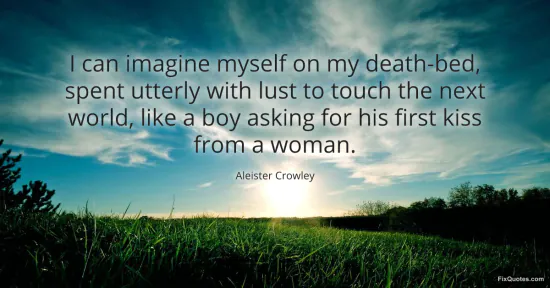 Crowley, Aleister. (2026, January 15). I can imagine myself on my death-bed, spent utterly with lust to touch the next world, like a boy asking for his first kiss from a woman. FixQuotes. https://fixquotes.com/quotes/i-can-imagine-myself-on-my-death-bed-spent-40150/