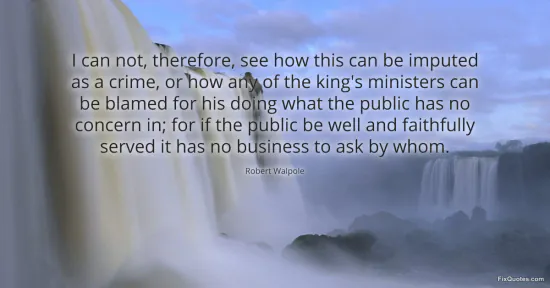 Walpole, Robert. (2026, January 18). I can not, therefore, see how this can be imputed as a crime, or how any of the king's ministers can be blamed for his doing what the public has no concern in; for if the public be well and faithfully served it has no business to ask by whom. FixQuotes. https://fixquotes.com/quotes/i-can-not-therefore-see-how-this-can-be-imputed-4732/