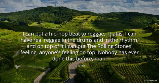 Turner, Ike. "I can put a hip-hop beat to reggae. That is, I can have real reggae in the drums and in the rhythm, and on top of it I can put The Rolling Stones' feeling, anyone's feeling on top. Nobody has ever done this before, man!" FixQuotes. February 18, 2026. https://fixquotes.com/quotes/i-can-put-a-hip-hop-beat-to-reggae-that-is-i-can-79788/.
