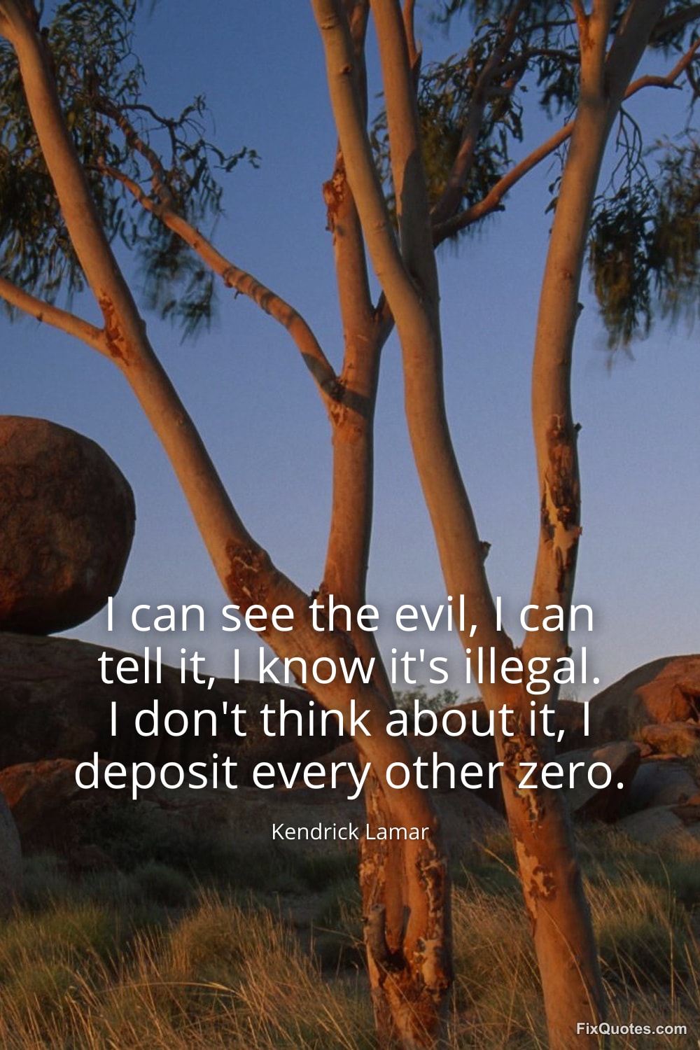 Lamar, Kendrick. (2026, February 1). I can see the evil, I can tell it, I know it's illegal. I don't think about it, I deposit every other zero. FixQuotes. https://fixquotes.com/quotes/i-can-see-the-evil-i-can-tell-it-i-know-its-184838/