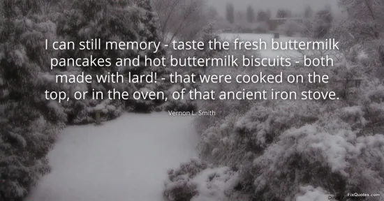 Smith, Vernon L. "I can still memory - taste the fresh buttermilk pancakes and hot buttermilk biscuits - both made with lard! - that were cooked on the top, or in the oven, of that ancient iron stove." FixQuotes. Accessed February 2, 2026. https://fixquotes.com/quotes/i-can-still-memory-taste-the-fresh-buttermilk-105520/.