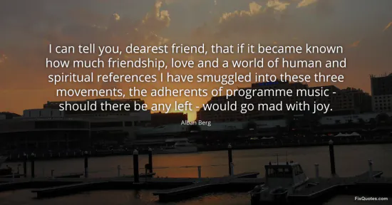 Berg, Alban. "I can tell you, dearest friend, that if it became known how much friendship, love and a world of human and spiritual references I have smuggled into these three movements, the adherents of programme music - should there be any left - would go mad with joy." FixQuotes. January 16, 2026. https://fixquotes.com/quotes/i-can-tell-you-dearest-friend-that-if-it-became-139365/.