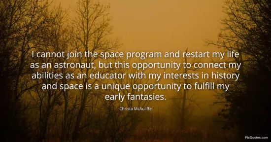 McAuliffe, Christa. "I cannot join the space program and restart my life as an astronaut, but this opportunity to connect my abilities as an educator with my interests in history and space is a unique opportunity to fulfill my early fantasies." FixQuotes. January 18, 2026. https://fixquotes.com/quotes/i-cannot-join-the-space-program-and-restart-my-20692/.