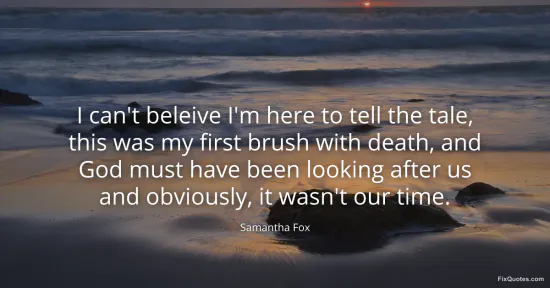 Fox, Samantha. "I can't beleive I'm here to tell the tale, this was my first brush with death, and God must have been looking after us and obviously, it wasn't our time." FixQuotes. January 16, 2026. https://fixquotes.com/quotes/i-cant-beleive-im-here-to-tell-the-tale-this-was-119364/.