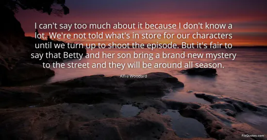 Woodard, Alfre. (2026, January 17). I can't say too much about it because I don't know a lot. We're not told what's in store for our characters until we turn up to shoot the episode. But it's fair to say that Betty and her son bring a brand new mystery to the street and they will be around all season. FixQuotes. https://fixquotes.com/quotes/i-cant-say-too-much-about-it-because-i-dont-know-37235/