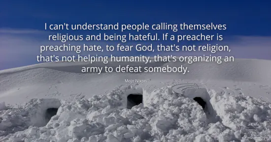 Nixon, Mojo. "I can't understand people calling themselves religious and being hateful. If a preacher is preaching hate, to fear God, that's not religion, that's not helping humanity, that's organizing an army to defeat somebody." FixQuotes. February 17, 2026. https://fixquotes.com/quotes/i-cant-understand-people-calling-themselves-108436/.