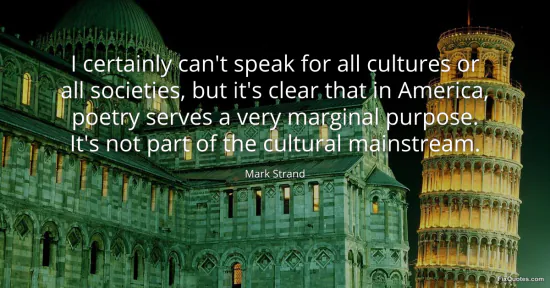 Strand, Mark. (2026, January 17). I certainly can't speak for all cultures or all societies, but it's clear that in America, poetry serves a very marginal purpose. It's not part of the cultural mainstream. FixQuotes. https://fixquotes.com/quotes/i-certainly-cant-speak-for-all-cultures-or-all-81652/