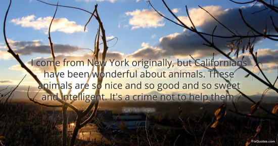 "I come from New York originally, but Californians have been wonderful about animals. These animals are so nice and so good and so sweet and intelligent. It's a crime not to help them." FixQuotes, 15 Jan. 2026, https://fixquotes.com/quotes/i-come-from-new-york-originally-but-californians-141259/. Accessed 22 Feb. 2026.