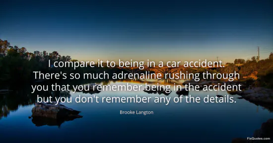 Langton, Brooke. "I compare it to being in a car accident. There's so much adrenaline rushing through you that you remember being in the accident but you don't remember any of the details." FixQuotes. January 15, 2026. https://fixquotes.com/quotes/i-compare-it-to-being-in-a-car-accident-theres-so-169299/.