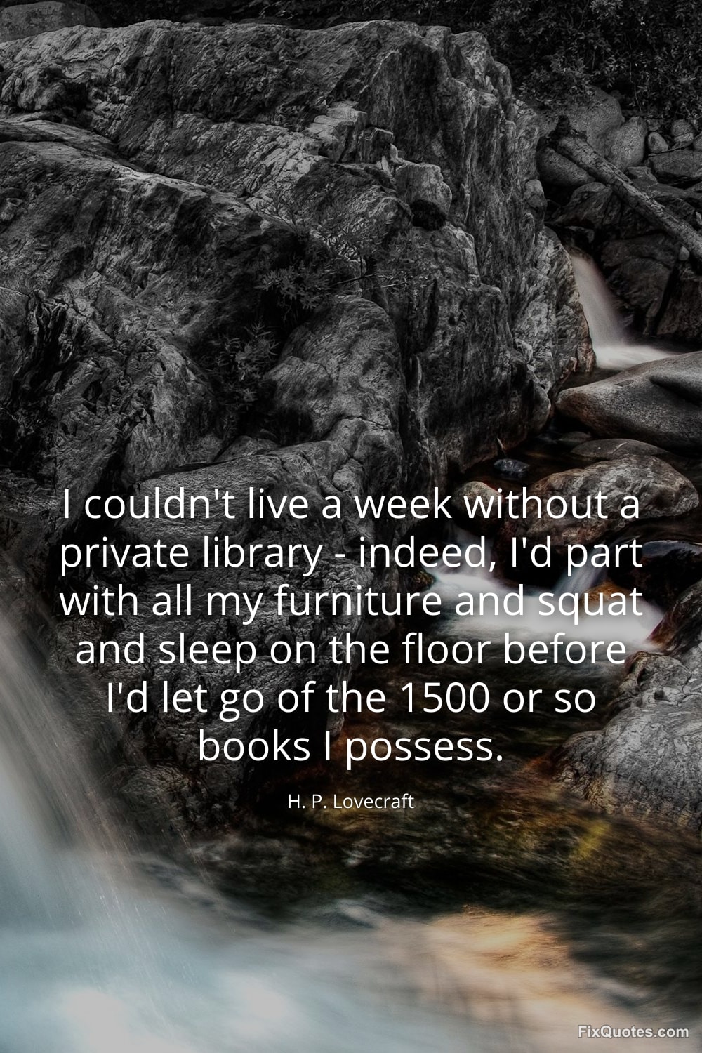 Lovecraft, H. P. (2026, January 17). I couldn't live a week without a private library - indeed, I'd part with all my furniture and squat and sleep on the floor before I'd let go of the 1500 or so books I possess. FixQuotes. https://fixquotes.com/quotes/i-couldnt-live-a-week-without-a-private-library-62660/