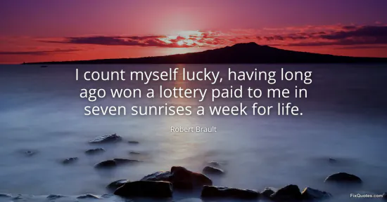 Brault turns gratitude into a small act of accounting, and the result is slyly radical: the richest “lottery” isn’t a windfall, it’s the steady stipend of time itself. “I count myself lucky” nods to cliché, then immediately hijacks it. Luck isn’t framed as a rare, cinematic jackpot but as a wage: “paid to me in seven sunrises a week for life.” The phrasing is deliberately transactional, as if dawn were direct deposit. That tension - cosmic gift rendered in the language of payroll - is the engine of the line.