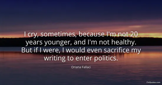 Fallaci, Oriana. (2026, January 15). I cry, sometimes, because I'm not 20 years younger, and I'm not healthy. But if I were, I would even sacrifice my writing to enter politics. FixQuotes. https://fixquotes.com/quotes/i-cry-sometimes-because-im-not-20-years-younger-155728/