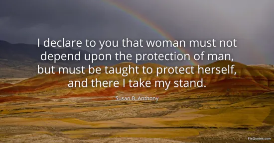 Anthony, Susan B. (2026, January 16). I declare to you that woman must not depend upon the protection of man, but must be taught to protect herself, and there I take my stand. FixQuotes. https://fixquotes.com/quotes/i-declare-to-you-that-woman-must-not-depend-upon-123694/