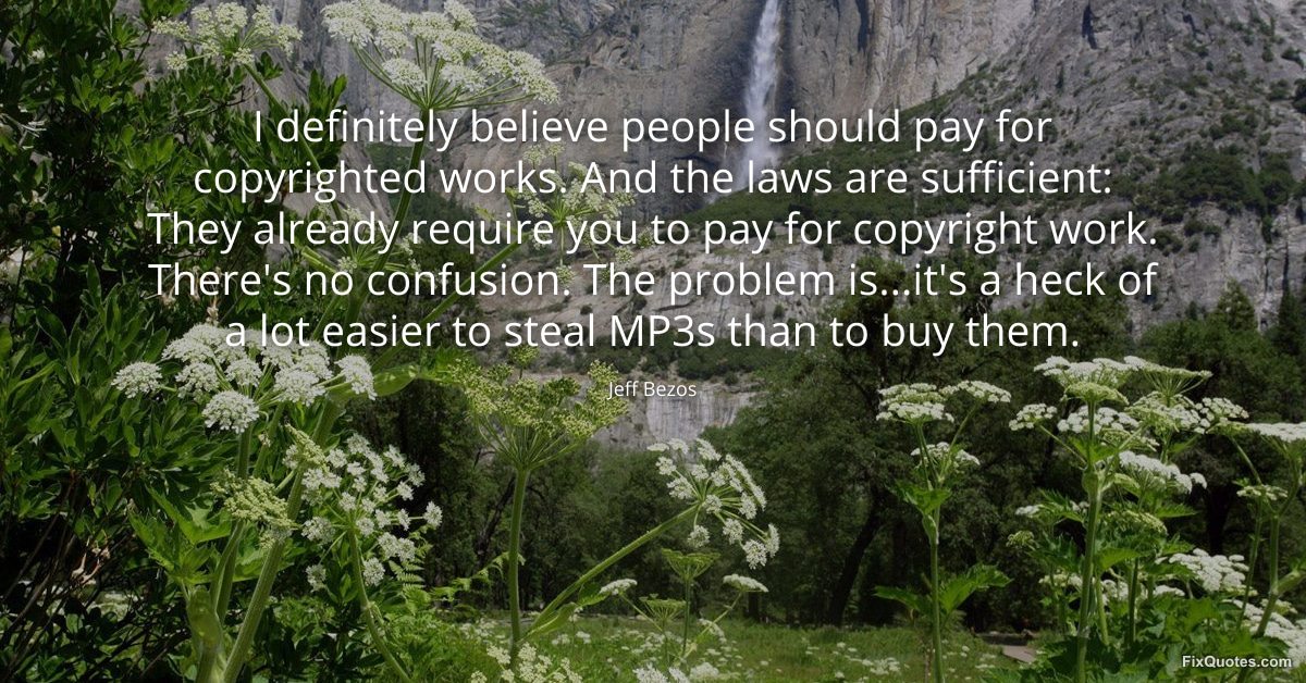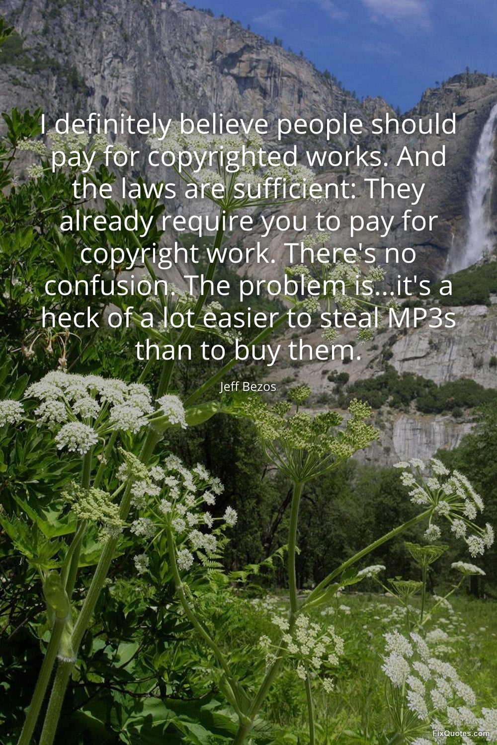 Bezos, Jeff. (2026, March 25). I definitely believe people should pay for copyrighted works. And the laws are sufficient: They already require you to pay for copyright work. There's no confusion. The problem is...it's a heck of a lot easier to steal MP3s than to buy them. FixQuotes. https://fixquotes.com/quotes/i-definitely-believe-people-should-pay-for-186469/