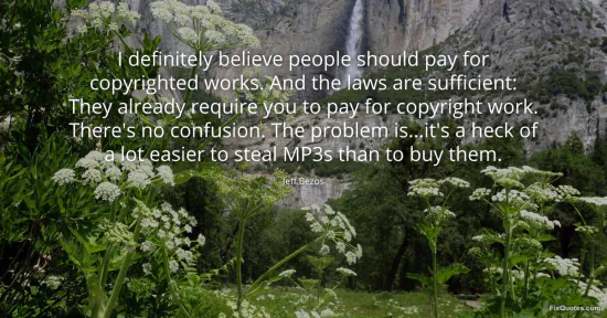 Bezos, Jeff. "I definitely believe people should pay for copyrighted works. And the laws are sufficient: They already require you to pay for copyright work. There's no confusion. The problem is...it's a heck of a lot easier to steal MP3s than to buy them." FixQuotes. March 25, 2026. https://fixquotes.com/quotes/i-definitely-believe-people-should-pay-for-186469/.