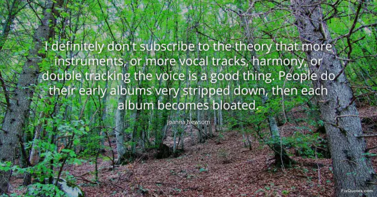 Newsom, Joanna. (2026, February 16). I definitely don't subscribe to the theory that more instruments, or more vocal tracks, harmony, or double tracking the voice is a good thing. People do their early albums very stripped down, then each album becomes bloated. FixQuotes. https://fixquotes.com/quotes/i-definitely-dont-subscribe-to-the-theory-that-147005/