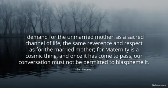 Lindsey, Ben. (2026, February 18). I demand for the unmarried mother, as a sacred channel of life, the same reverence and respect as for the married mother; for Maternity is a cosmic thing, and once it has come to pass, our conversation must not be permitted to blaspheme it. FixQuotes. https://fixquotes.com/quotes/i-demand-for-the-unmarried-mother-as-a-sacred-62583/