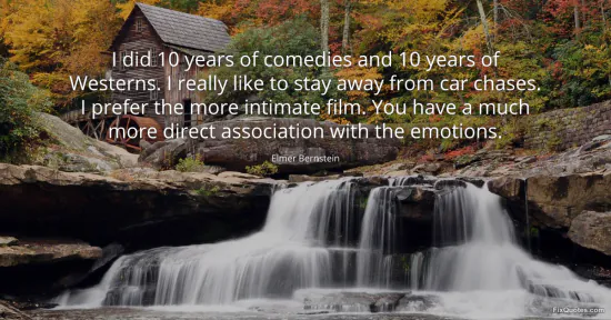 Bernstein, Elmer. "I did 10 years of comedies and 10 years of Westerns. I really like to stay away from car chases. I prefer the more intimate film. You have a much more direct association with the emotions." FixQuotes. January 17, 2026. https://fixquotes.com/quotes/i-did-10-years-of-comedies-and-10-years-of-68101/.