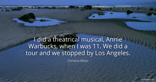 Milian, Christina. (2026, January 17). I did a theatrical musical, Annie Warbucks, when I was 11. We did a tour and we stopped by Los Angeles. FixQuotes. https://fixquotes.com/quotes/i-did-a-theatrical-musical-annie-warbucks-when-i-44689/