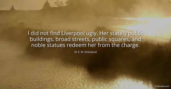 Sherwood, M. E. W. "I did not find Liverpool ugly. Her stately public buildings, broad streets, public squares, and noble statues redeem her from the charge." FixQuotes. January 17, 2026. https://fixquotes.com/quotes/i-did-not-find-liverpool-ugly-her-stately-public-68455/.