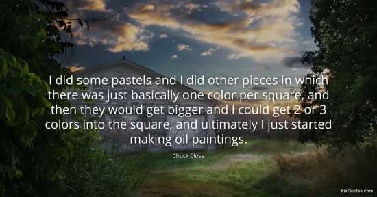 Close, Chuck. (2026, January 15). I did some pastels and I did other pieces in which there was just basically one color per square, and then they would get bigger and I could get 2 or 3 colors into the square, and ultimately I just started making oil paintings. FixQuotes. https://fixquotes.com/quotes/i-did-some-pastels-and-i-did-other-pieces-in-143343/