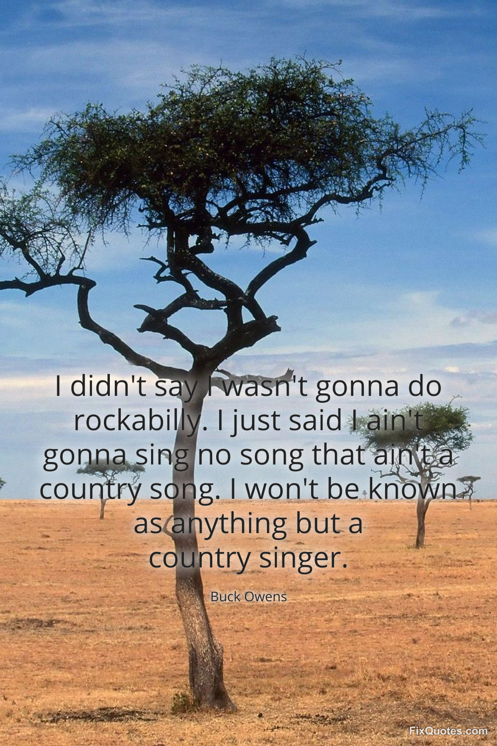 Owens, Buck. "I didn't say I wasn't gonna do rockabilly. I just said I ain't gonna sing no song that ain't a country song. I won't be known as anything but a country singer." FixQuotes. January 17, 2026. https://fixquotes.com/quotes/i-didnt-say-i-wasnt-gonna-do-rockabilly-i-just-44134/.