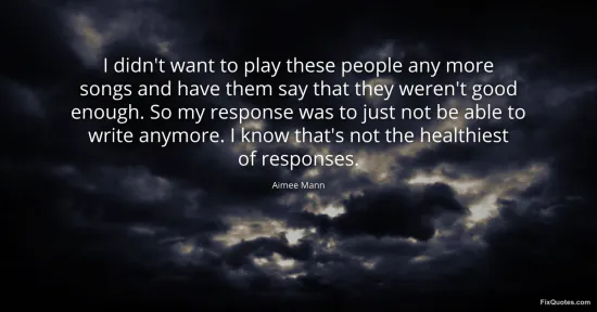 Mann, Aimee. "I didn't want to play these people any more songs and have them say that they weren't good enough. So my response was to just not be able to write anymore. I know that's not the healthiest of responses." FixQuotes. January 17, 2026. https://fixquotes.com/quotes/i-didnt-want-to-play-these-people-any-more-songs-60745/.