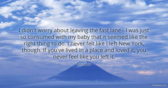 Spacek, Sissy. (2026, January 16). I didn't worry about leaving the fast lane - I was just so consumed with my baby that it seemed like the right thing to do. I never felt like I left New York, though. If you've lived in a place and loved it, you never feel like you left it. FixQuotes. https://fixquotes.com/quotes/i-didnt-worry-about-leaving-the-fast-lane-i-was-102982/