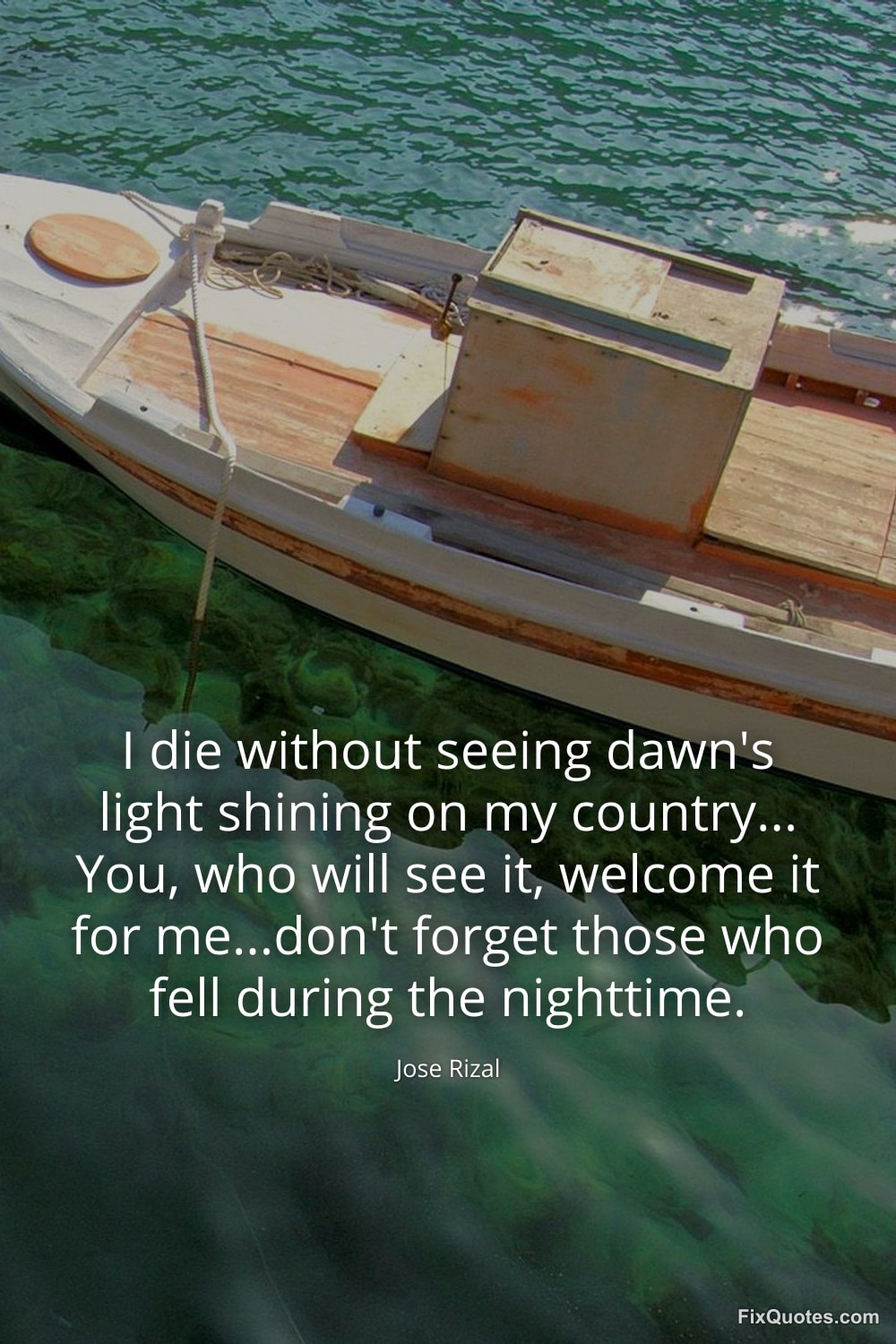 Rizal, Jose. (2026, January 14). I die without seeing dawn's light shining on my country... You, who will see it, welcome it for me...don't forget those who fell during the nighttime. FixQuotes. https://fixquotes.com/quotes/i-die-without-seeing-dawns-light-shining-on-my-173352/