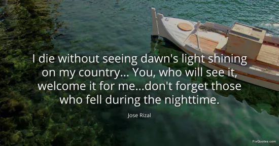 Rizal, Jose. "I die without seeing dawn's light shining on my country... You, who will see it, welcome it for me...don't forget those who fell during the nighttime." FixQuotes. January 14, 2026. https://fixquotes.com/quotes/i-die-without-seeing-dawns-light-shining-on-my-173352/.