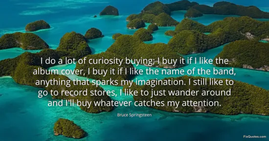 Springsteen, Bruce. "I do a lot of curiosity buying; I buy it if I like the album cover, I buy it if I like the name of the band, anything that sparks my imagination. I still like to go to record stores, I like to just wander around and I'll buy whatever catches my attention." FixQuotes. January 15, 2026. https://fixquotes.com/quotes/i-do-a-lot-of-curiosity-buying-i-buy-it-if-i-like-142046/.