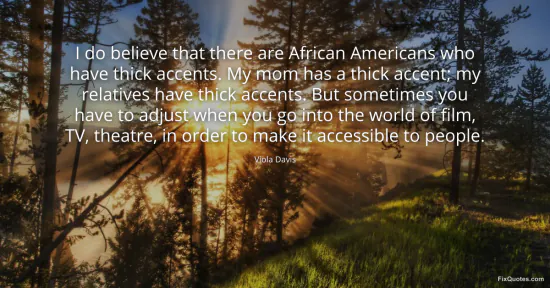 Davis, Viola. "I do believe that there are African Americans who have thick accents. My mom has a thick accent; my relatives have thick accents. But sometimes you have to adjust when you go into the world of film, TV, theatre, in order to make it accessible to people." FixQuotes. January 18, 2026. https://fixquotes.com/quotes/i-do-believe-that-there-are-african-americans-who-21812/.