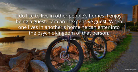Kosinski, Jerzy. (2026, January 17). I do like to live in other people's homes. I enjoy being a guest. I am an inexpensive guest. When one lives in another's home he can enter into the psychic kingdom of that person. FixQuotes. https://fixquotes.com/quotes/i-do-like-to-live-in-other-peoples-homes-i-enjoy-51568/