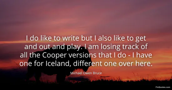 Bruce, Michael Owen. (2026, January 16). I do like to write but I also like to get and out and play. I am losing track of all the Cooper versions that I do - I have one for Iceland, different one over here. FixQuotes. https://fixquotes.com/quotes/i-do-like-to-write-but-i-also-like-to-get-and-out-133831/