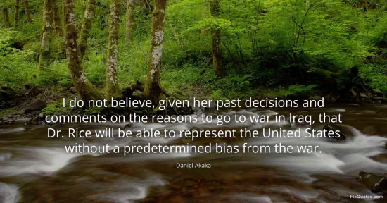 Akaka, Daniel. "I do not believe, given her past decisions and comments on the reasons to go to war in Iraq, that Dr. Rice will be able to represent the United States without a predetermined bias from the war." FixQuotes. January 15, 2026. https://fixquotes.com/quotes/i-do-not-believe-given-her-past-decisions-and-143501/.