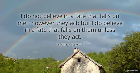Chesterton, Gilbert K. "I do not believe in a fate that falls on men however they act; but I do believe in a fate that falls on them unless they act." FixQuotes. January 15, 2026. https://fixquotes.com/quotes/i-do-not-believe-in-a-fate-that-falls-on-men-7373/.
