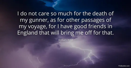 Kidd, William. (2026, January 16). I do not care so much for the death of my gunner, as for other passages of my voyage, for I have good friends in England that will bring me off for that. FixQuotes. https://fixquotes.com/quotes/i-do-not-care-so-much-for-the-death-of-my-gunner-91570/
