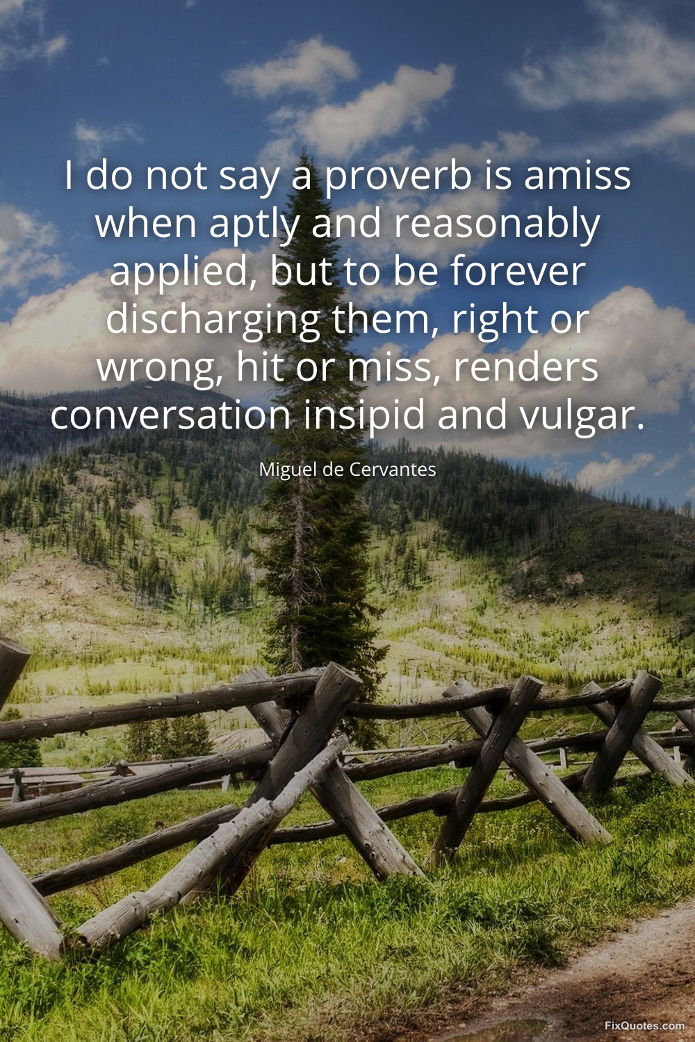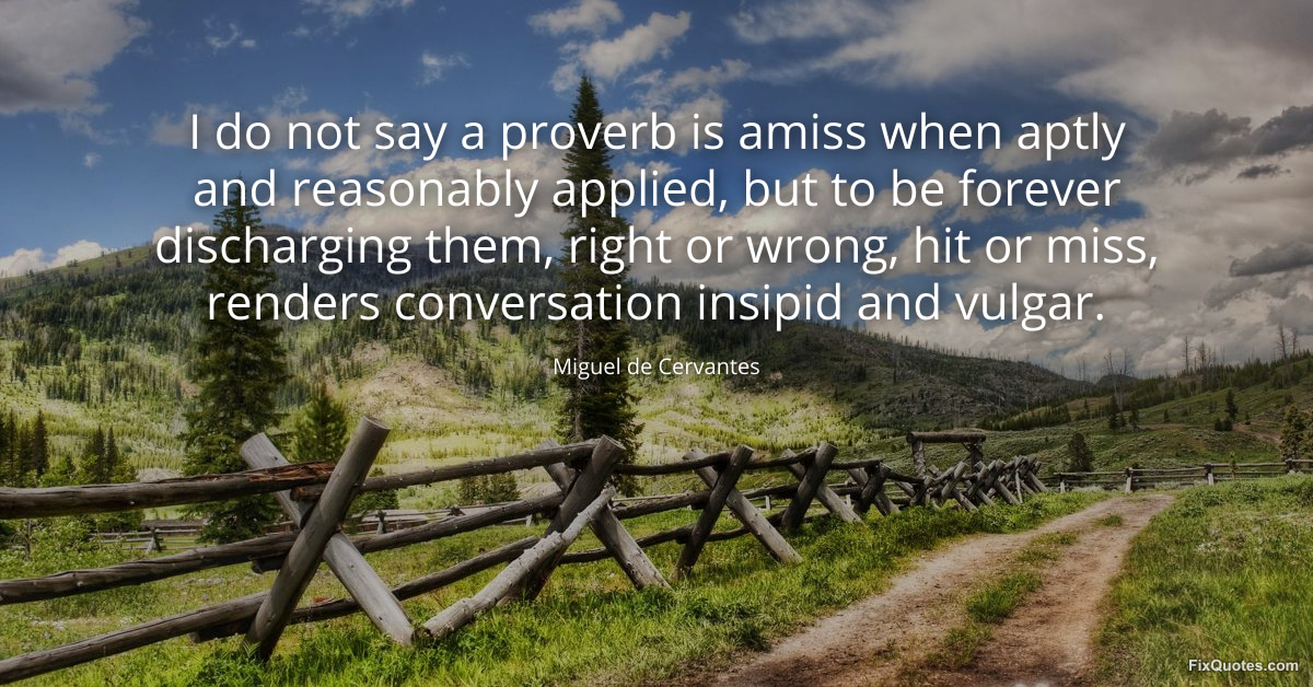 Cervantes, Miguel de. (2026, January 17). I do not say a proverb is amiss when aptly and reasonably applied, but to be forever discharging them, right or wrong, hit or miss, renders conversation insipid and vulgar. FixQuotes. https://fixquotes.com/quotes/i-do-not-say-a-proverb-is-amiss-when-aptly-and-80156/
