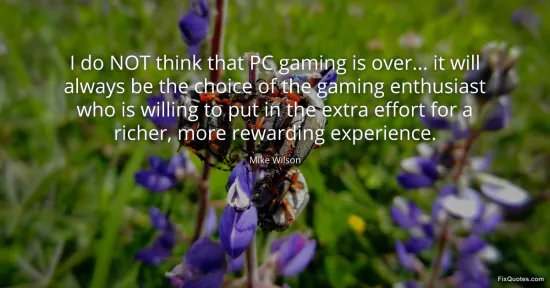 Wilson, Mike. "I do NOT think that PC gaming is over... it will always be the choice of the gaming enthusiast who is willing to put in the extra effort for a richer, more rewarding experience." FixQuotes. January 16, 2026. https://fixquotes.com/quotes/i-do-not-think-that-pc-gaming-is-over-it-will-93456/.