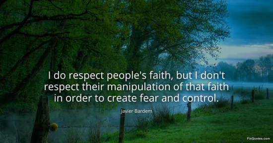 Bardem, Javier. (2026, January 16). I do respect people's faith, but I don't respect their manipulation of that faith in order to create fear and control. FixQuotes. https://fixquotes.com/quotes/i-do-respect-peoples-faith-but-i-dont-respect-95513/
