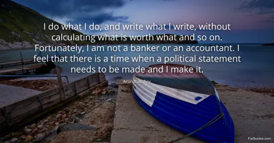 Roy, Arundhati. "I do what I do, and write what I write, without calculating what is worth what and so on. Fortunately, I am not a banker or an accountant. I feel that there is a time when a political statement needs to be made and I make it." FixQuotes. January 16, 2026. https://fixquotes.com/quotes/i-do-what-i-do-and-write-what-i-write-without-138045/.