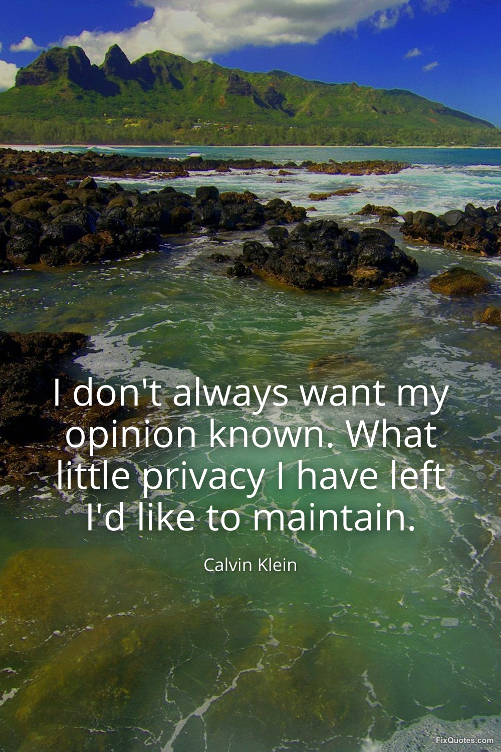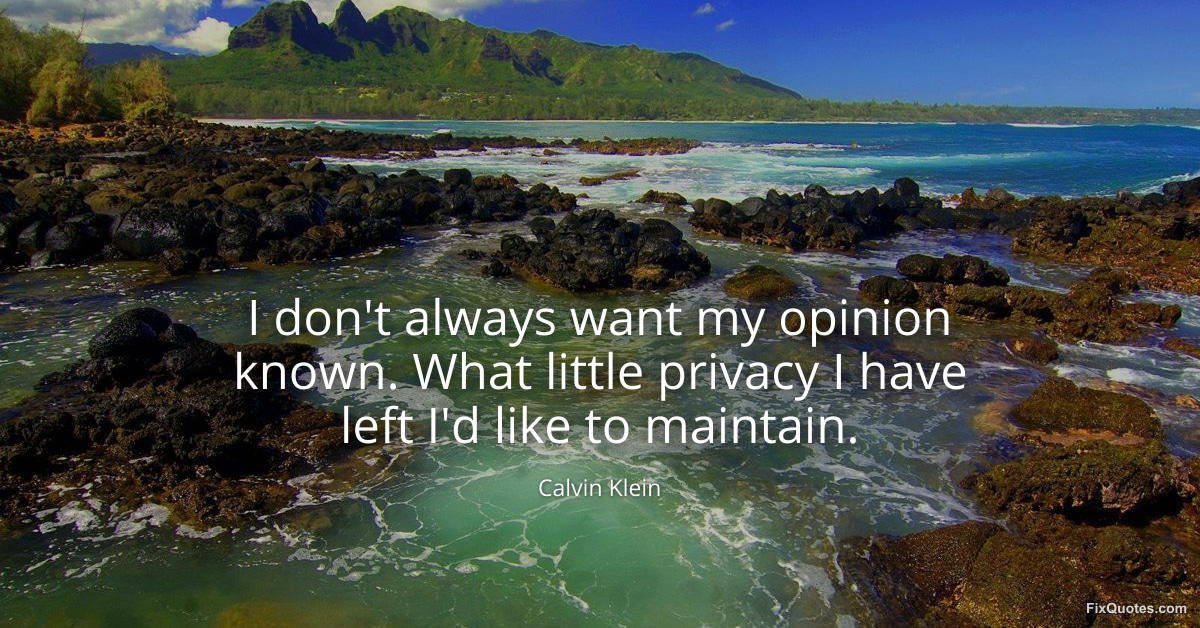 Klein, Calvin. (2026, January 17). I don't always want my opinion known. What little privacy I have left I'd like to maintain. FixQuotes. https://fixquotes.com/quotes/i-dont-always-want-my-opinion-known-what-little-24400/