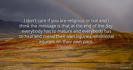 Kodjoe, Boris. (2026, January 18). I don't care if you are religious or not and I think the message is that at the end of the day, everybody has to mature and everybody has to heal and mend their own injuries, emotional injuries, on their own pace. FixQuotes. https://fixquotes.com/quotes/i-dont-care-if-you-are-religious-or-not-and-i-4269/
