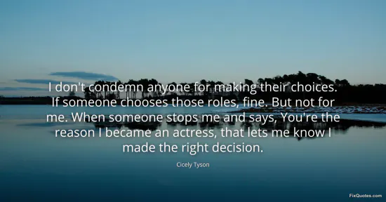 Tyson, Cicely. "I don't condemn anyone for making their choices. If someone chooses those roles, fine. But not for me. When someone stops me and says, You're the reason I became an actress, that lets me know I made the right decision." FixQuotes. January 15, 2026. https://fixquotes.com/quotes/i-dont-condemn-anyone-for-making-their-choices-if-169322/.