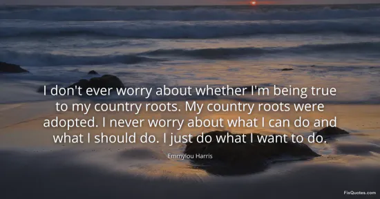 Harris, Emmylou. "I don't ever worry about whether I'm being true to my country roots. My country roots were adopted. I never worry about what I can do and what I should do. I just do what I want to do." FixQuotes. January 16, 2026. https://fixquotes.com/quotes/i-dont-ever-worry-about-whether-im-being-true-to-125074/.