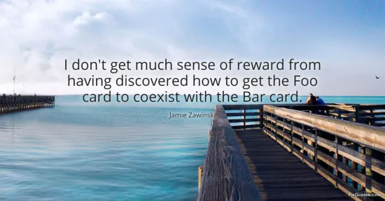 Zawinski, Jamie. "I don't get much sense of reward from having discovered how to get the Foo card to coexist with the Bar card." FixQuotes. January 16, 2026. https://fixquotes.com/quotes/i-dont-get-much-sense-of-reward-from-having-117659/.