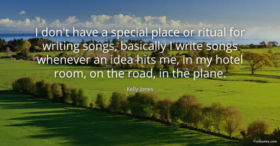 Jones, Kelly. "I don't have a special place or ritual for writing songs, basically I write songs whenever an idea hits me, in my hotel room, on the road, in the plane." FixQuotes. January 15, 2026. https://fixquotes.com/quotes/i-dont-have-a-special-place-or-ritual-for-writing-147262/.