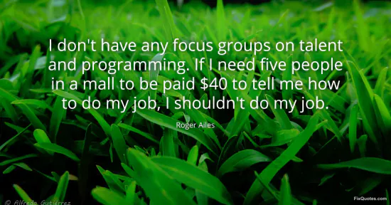 Ailes, Roger. "I don't have any focus groups on talent and programming. If I need five people in a mall to be paid $40 to tell me how to do my job, I shouldn't do my job." FixQuotes. January 15, 2026. https://fixquotes.com/quotes/i-dont-have-any-focus-groups-on-talent-and-163128/.