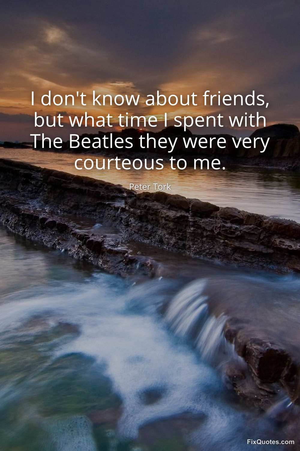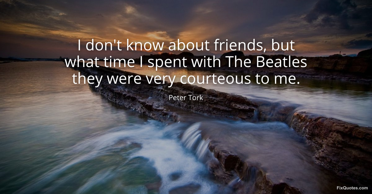Tork, Peter. (2026, January 15). I don't know about friends, but what time I spent with The Beatles they were very courteous to me. FixQuotes. https://fixquotes.com/quotes/i-dont-know-about-friends-but-what-time-i-spent-147834/